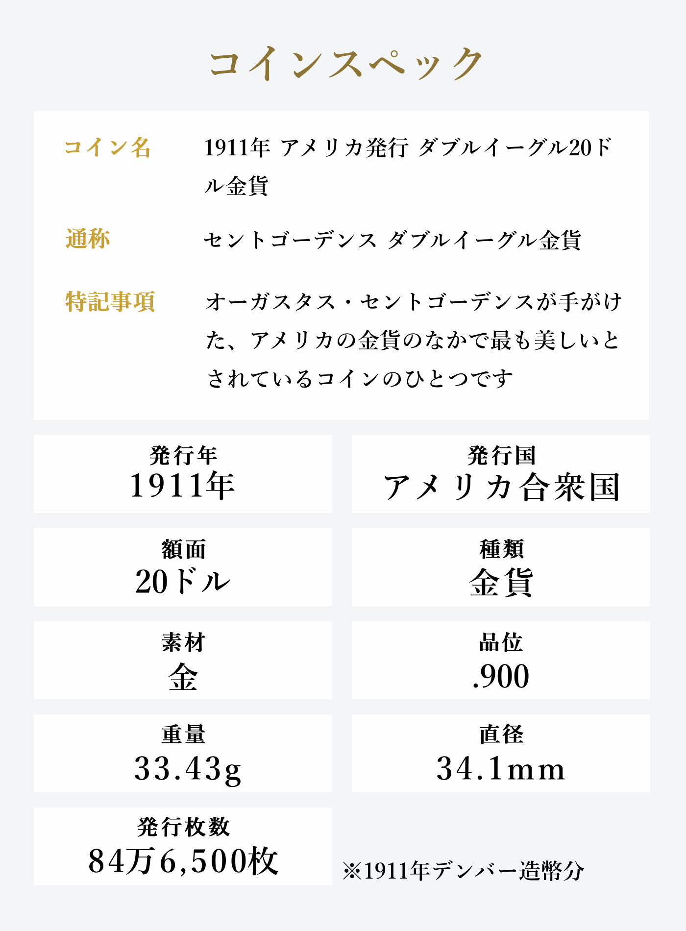 1911年発行のセントゴーデンス ダブルイーグル金貨は、「アメリカで最も美しい金貨」として知られる名品。