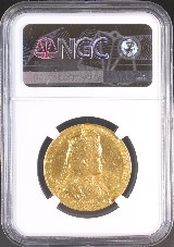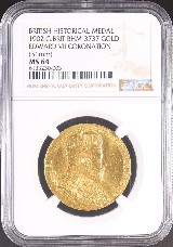 この金メダルの公式発行枚数はわずか2,728枚。もともと戴冠式の贈呈用として製作された非流通品であり、市場に姿を現す機会は非常に限られています。さらに、NGCに鑑定登録されている個体は、全世界でわずか35枚にとどまり、そのうちMS64以上という高グレード評価を受けたものは合計で9枚のみ。なかでもMS64はわずか4枚しか存在せず、この等級に到達した個体の希少性は際立っています。