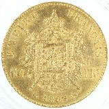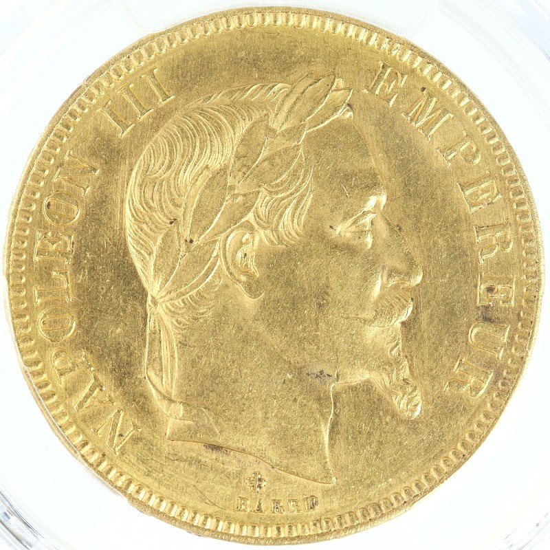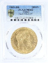 本コインはその治世末期、1869年に発行された100フラン金貨。